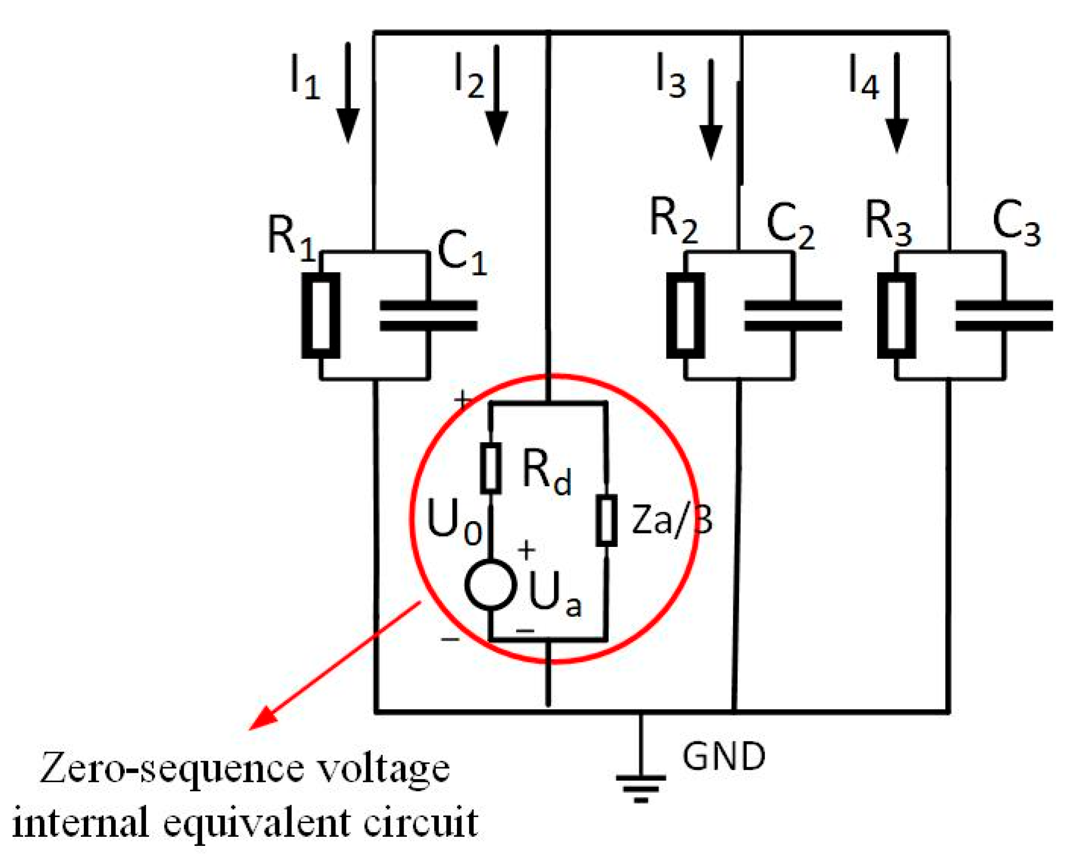Figure 1, four cables operate normally. Assume a single-phase high-impedance ground fault occurs on the second cable. This generates zero-sequence current in the system. The equivalent zero-sequence network is depicted in