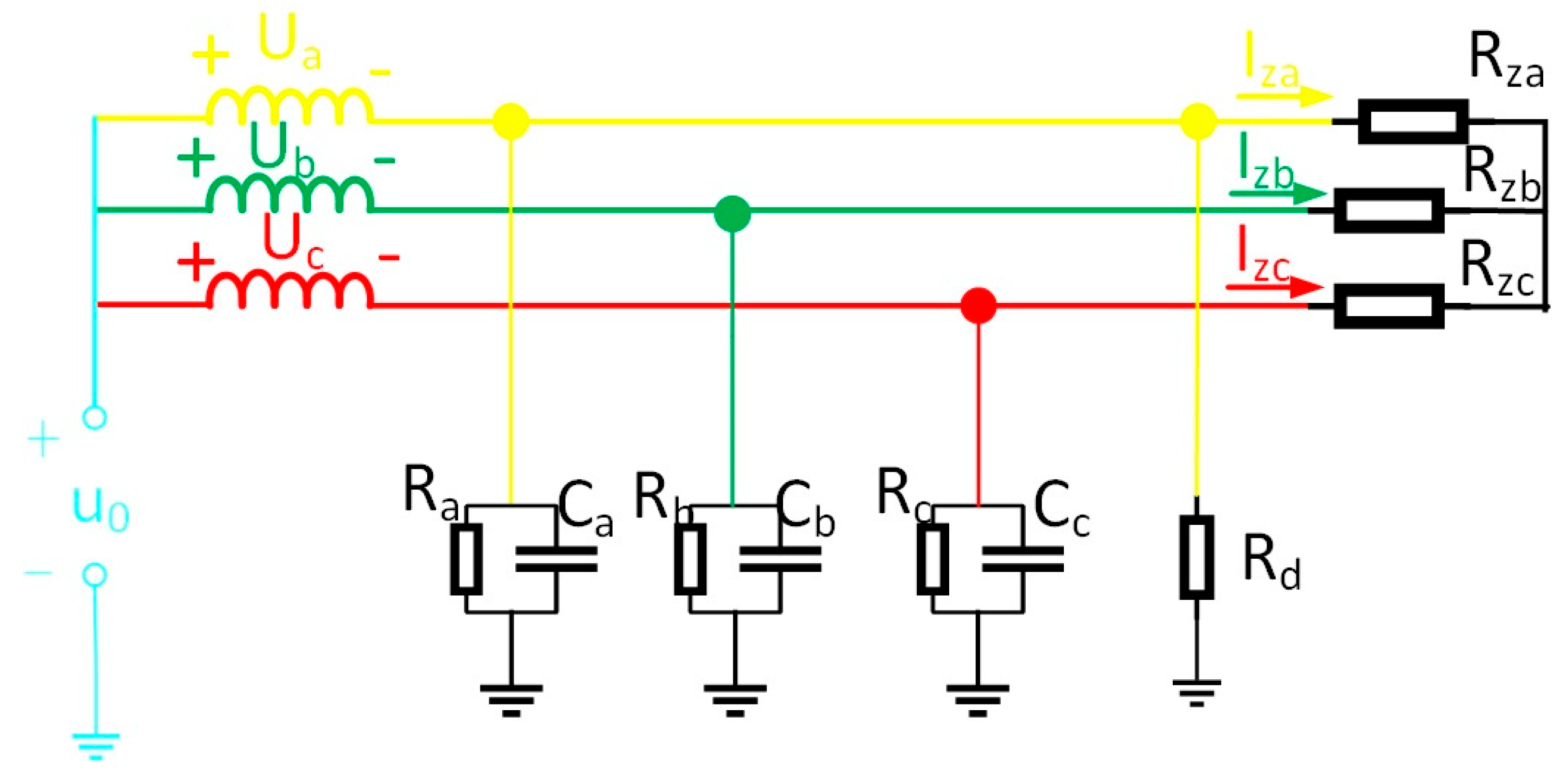 represents the equivalent resistance value of the faulted line. Based on the three-phase characteristics of the line, the three-phase insulation impedance and three-phase distributed capacitance of the cable are all equal, i.e.,