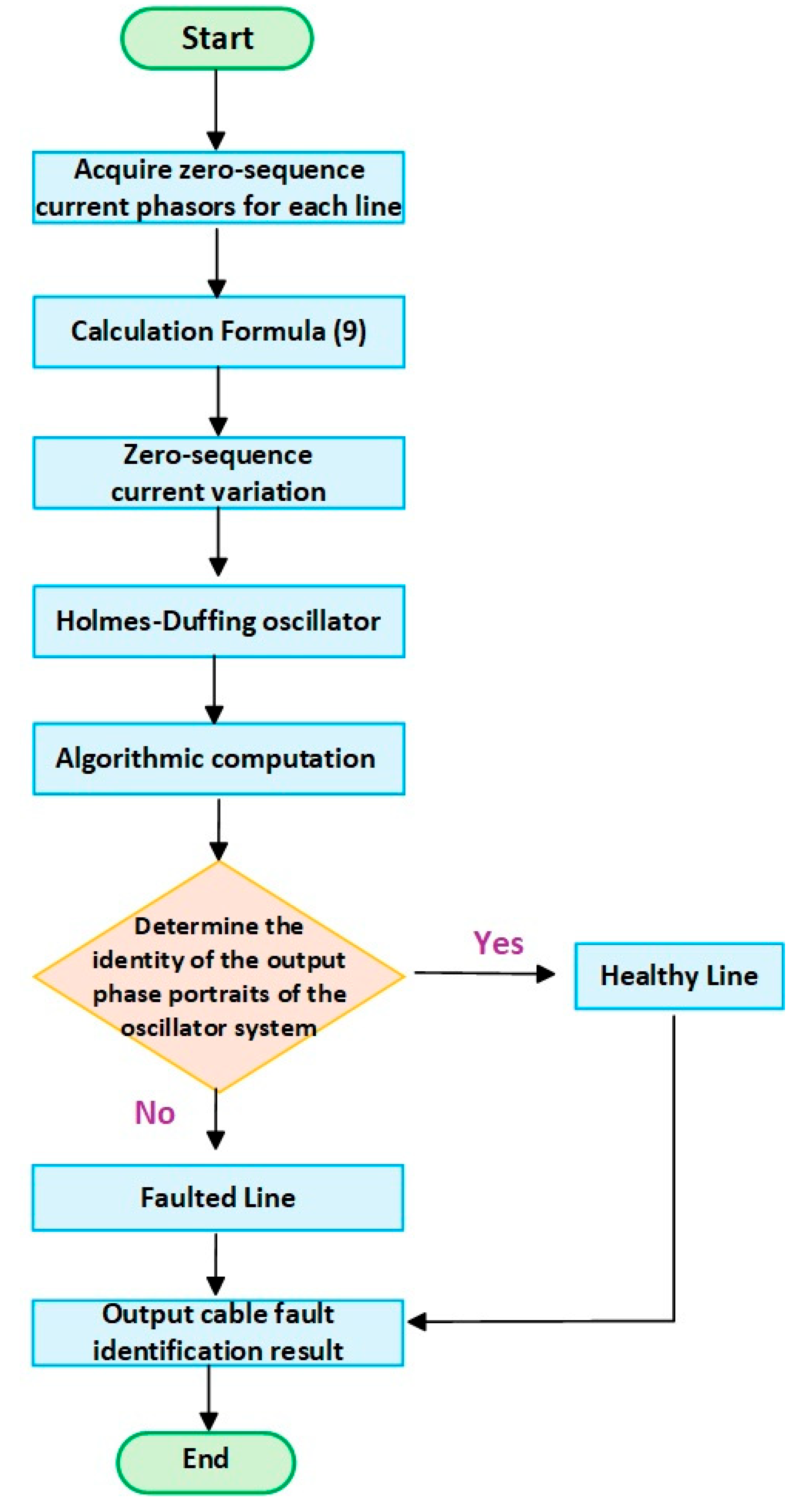 Coal mining environments yield microampere-scale line zero-sequence current changes. Practically, minute signals resist reliable recognition and incur high interference vulnerability. This work tackles this via a novel high-resistance grounding fault detection method merging steady-state impedance analysis with Holmes–Duffing oscillators. The approach extracts zero-sequence current features through impedance analysis, feeds them into noise-immune Holmes–Duffing systems for precise identification, and resolves minute fault signal recognition.