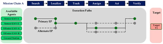 A schematic diagram illustrating the Execution Path concept is presented in Figure 2. The diagram shows how a single Mission Chain (top bar) can be realized by different combinations of available agents (left box). The green path represents a potential primary EP, utilizing a preferred set of agents. The gray paths represent alternative EPs, which provide system redundancy and adaptability by assigning tasks to other available agents. Each node on a path signifies a specific agent performing a specific phase of the mission, visually mapping the collaborative workflow from start to finish.