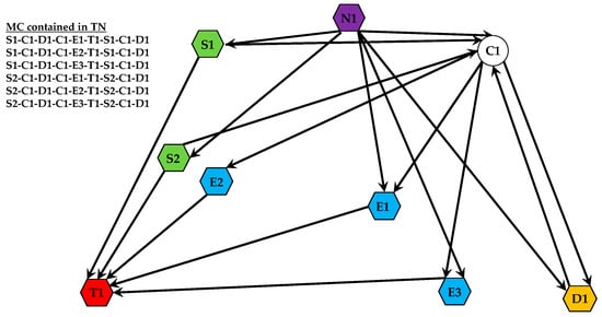 A TN can be conceptualized as a network composed of all feasible EPs for a given target. This construct allows for a systematic analysis of different collaborative strategies, enabling the selection of the most efficient path based on criteria such as success probability or resource cost. As illustrated in Figure 3, the Task Network for a target is formed by the connections between all relevant system assets. In this example, S1 and S2 are sensor platforms, E1, E2, and E3 are effector platforms, C1 is a communication node, and D1 is a decision-making module. The entire web of connections represents the TN, while a single path through it (e.g., from a sensor to an effector to the target T1) constitutes one EP.