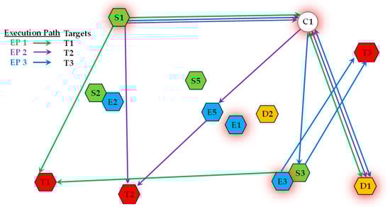 An MP represents a comprehensive course of action for the entire system. It enables agents to reuse resources across different Execution Paths, thereby leveraging synergistic benefits. As shown in Figure 4, an MP composed of three distinct Execution Paths is presented. These paths are used to handle targets T1, T2, and T3, respectively. The figure illustrates how multiple platforms can be involved in different EPs. For instance, the communication platform C1 and decision-making platform D1 support all three paths, while sensor S1 contributes to the EPs for both T1 and T2, demonstrating efficient resource sharing.