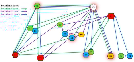 For example, a sensor node S can be connected to a target node T to represent a detection or tracking action. An effector node E connects to a target node T to represent a task servicing action. Both S and E nodes are connected to decision D and communication C nodes, which are essential for coordinated operations. The goal of the system is to form effective Execution Paths (e.g., S→D→E→T) that constitute a globally optimal Mission Plan within the Solution Space.