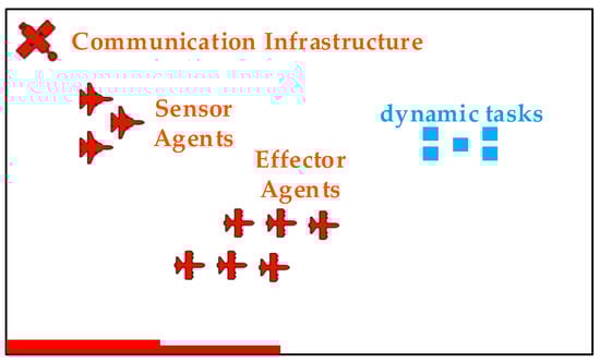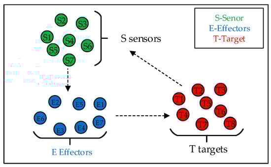 Therefore, the operational concept is abstracted in Figure 9. A fleet of S sensor agents is tasked with discovering and tracking T dynamic targets. Guided by the information provided by the sensors, the system must then assign E effector agents to service these targets. The agents are distributed throughout the operational area. The fundamental challenge is to solve this Sensor–Effector–Target Assignment problem to maximize mission effectiveness. For simplicity in our model, we will henceforth refer to the reconnaissance platforms as sensors and the task-servicing platforms as effectors.