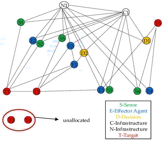 The operational scenario can be modeled as a dynamic graph, as shown in Figure 8. Each entity—sensor, effector, decision node, communication link, and target—is represented as a node in the network. The edges between nodes represent potential interactions, such as information flow, command-and-control relationships, or resource dependencies.