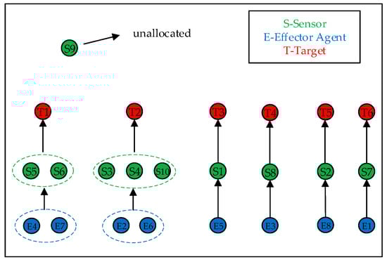 The first category focuses on solving single-stage assignment problems, treating sensing and effecting as isolated sub-problems. For instance, significant work has been performed on optimizing sensor coverage [17] or assigning effector UAVs to specific targets [18,19,20]. While these methods are effective for their designated tasks, they inherently fail to optimize the end-to-end mission workflow. They overlook the critical dependencies between stages—for example, how an initial, high-quality sensor assignment can dramatically increase the probability of success for a subsequent effector action. This compartmentalized approach prevents the system from achieving true synergistic collaboration.