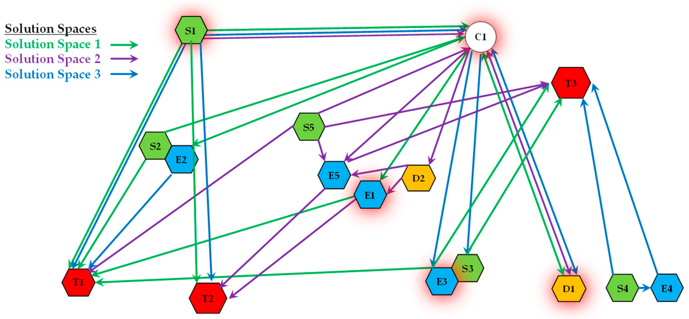 Figure 5 provides a visual representation of a Solution Space. In this diagram, nodes represent operational resources (e.g., sensors, effector agents) and targets. The paths in different colors (e.g., red, green, blue) each represent a distinct Mission Plan for accomplishing a set of tasks. Critically, we can observe that some resource nodes are shared by multiple paths (i.e., multiple MPs). This visualization clearly illustrates the core concept of a Solution Space: a complex web of overlapping and interconnected mission plans that draw from a common pool of resources.