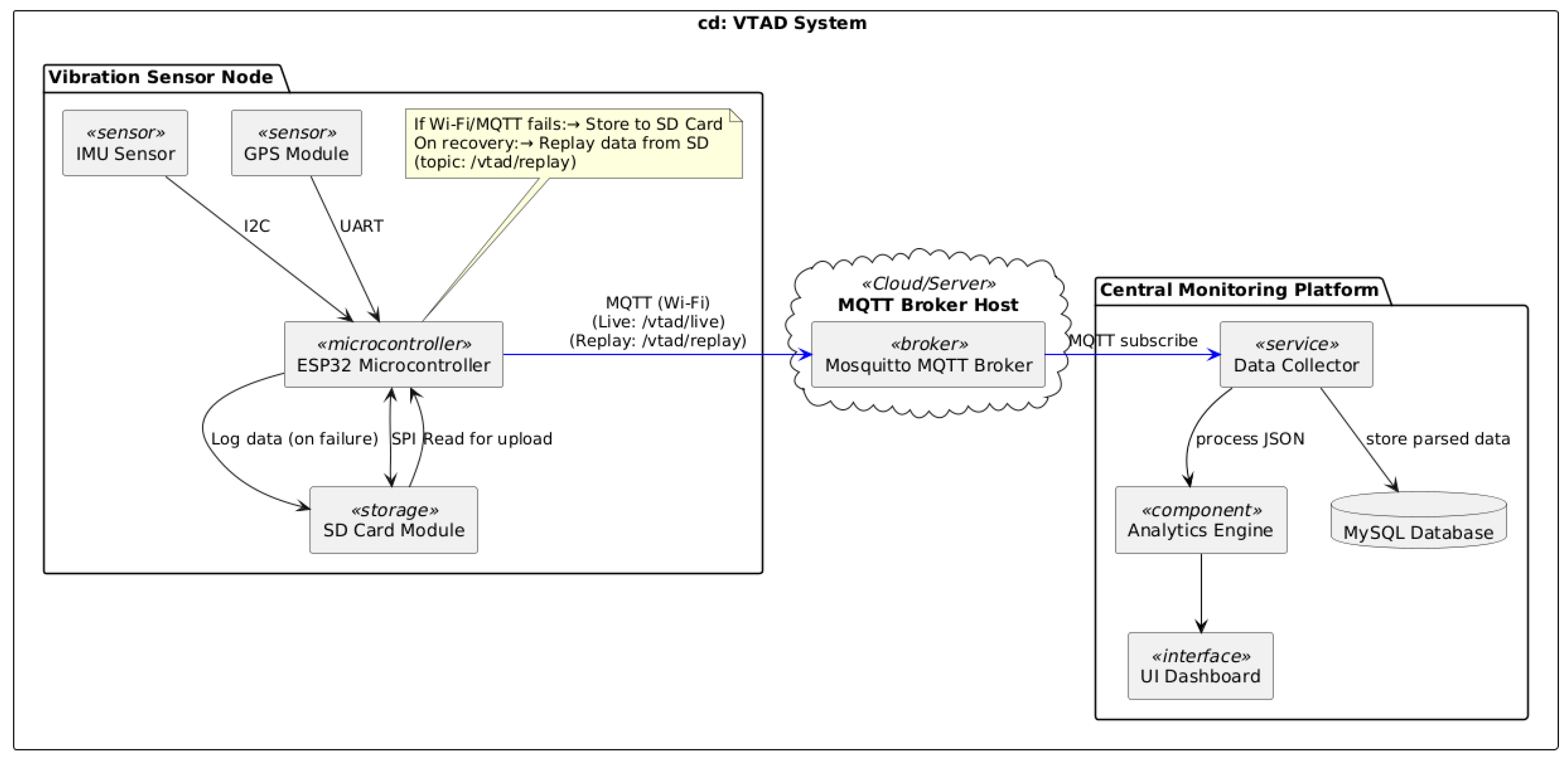 Figure 1 outlines the system architecture. The system comprises three core logical components: the Vibration Sensor Node, the Mosquitto MQTT Broker, and the Central Monitoring Platform. Vibration Sensor Node: Deployed on vehicles, this node integrates an ESP32 with an IMU Sensor for vibration data, a GPS Module for location, and an SD Card Module for local data storage. The ESP32 publishes live data to the MQTT Broker via Wi-Fi. Crucially, if Wi-Fi/MQTT connectivity fails, data is logged to the SD Card and replayed for upload upon network recovery, ensuring data resilience. Mosquitto Message Queuing Telemetry Transport (MQTT) Broker facilitates real-time, publish-subscribe communication, receiving data from sensor nodes and distributing it to the Central Monitoring Platform. Central Monitoring Platform processes and stores the collected data. It includes a Data Collector Service that subscribes to the MQTT Broker, receiving both live and replayed data, and stores this raw information in a MySQL Database.