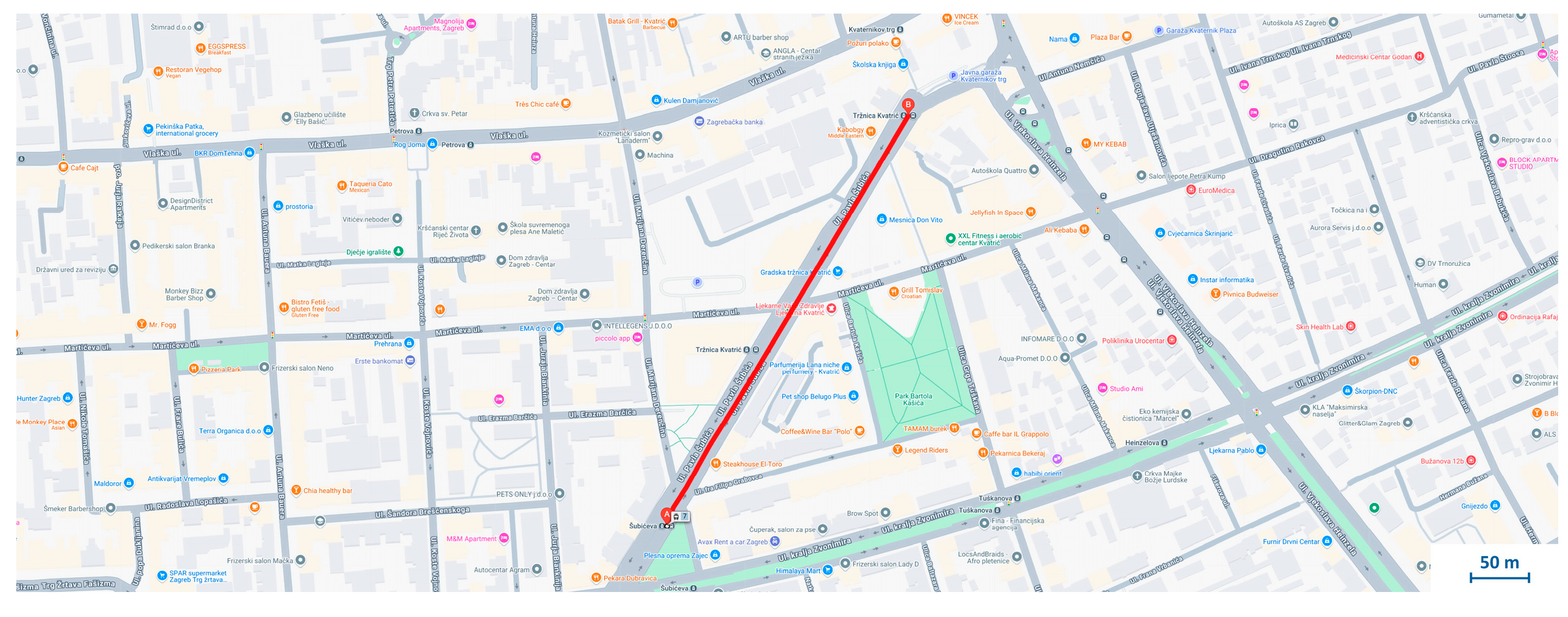 The analysis was carried out on a section of Šubićeva Street in Zagreb, as shown in