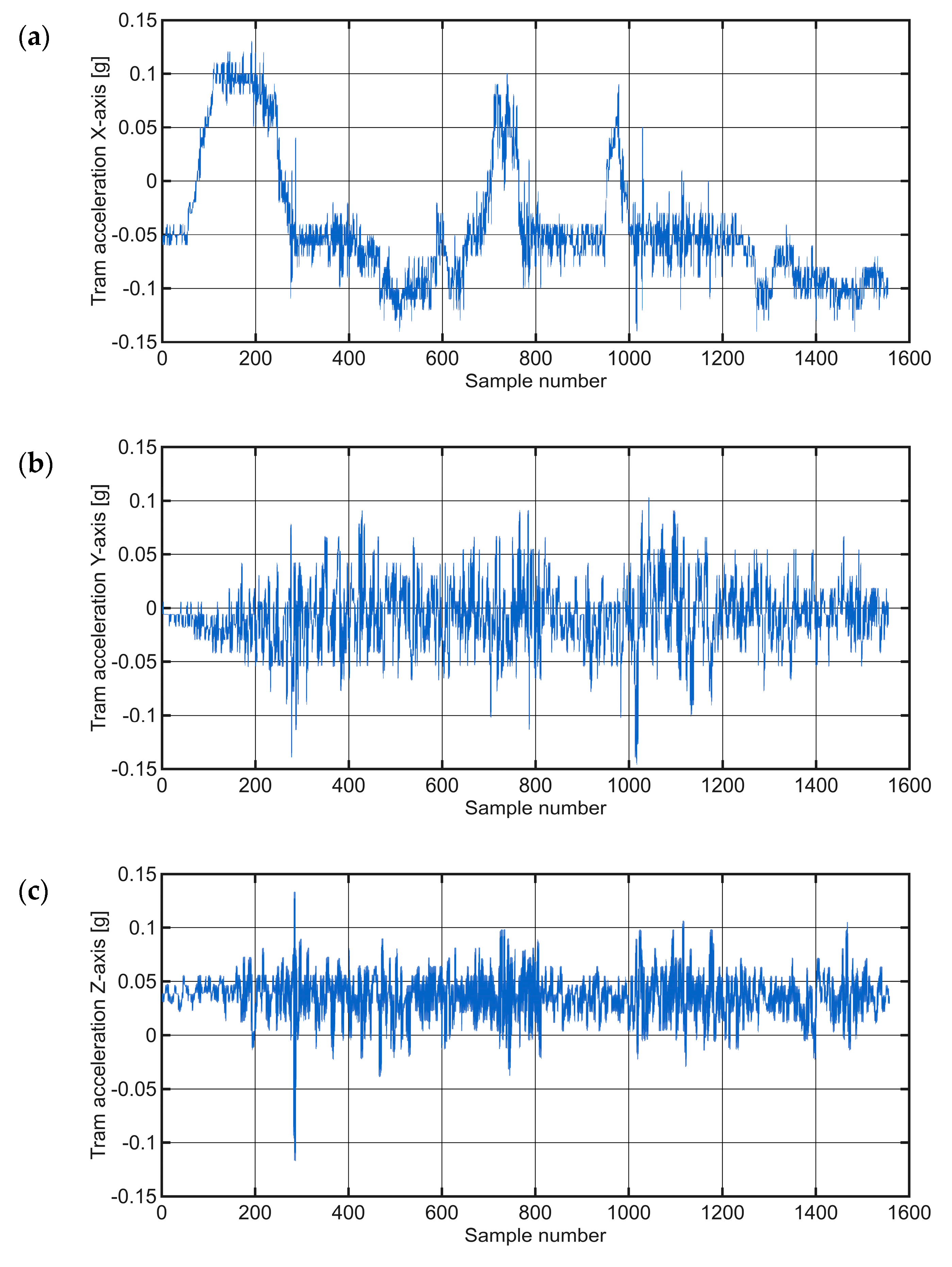 Figure 11 shows the raw time-series data of tram acceleration in all three axes, while