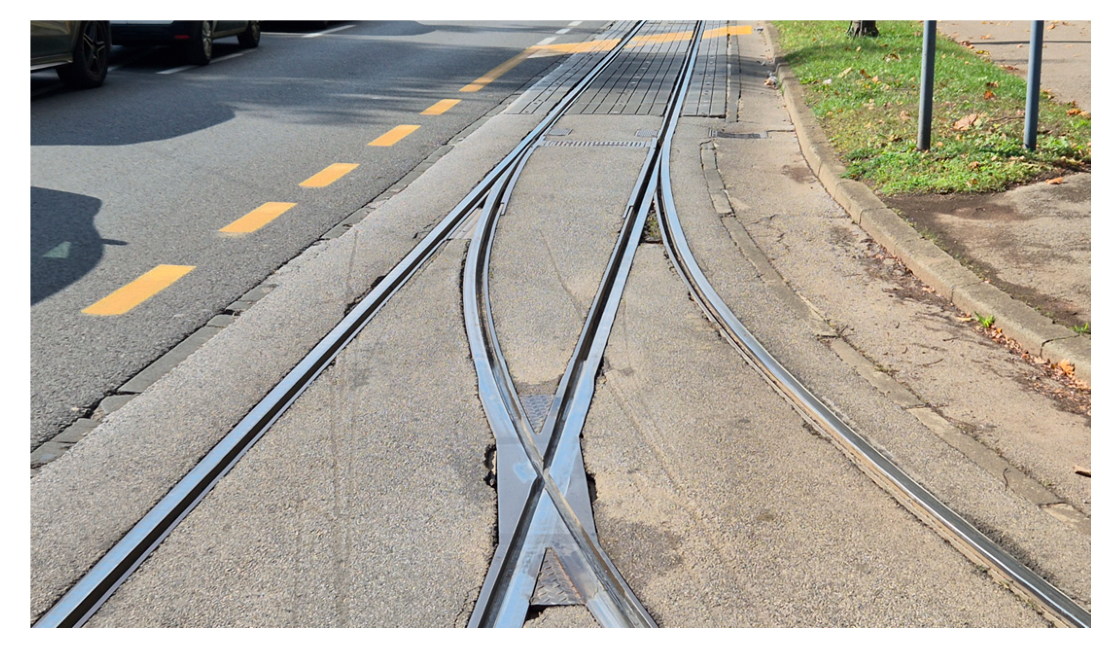 Figure 14. Tram junctions and crossings over curved tracks naturally generate stronger vibrations than straight sections. This operational context requires an adaptive threshold for anomaly detection that can account for the expected variations in vibration patterns depending on the operating environment. This requirement emphasizes the importance of contextual awareness for accurate anomaly detection in different operational scenarios. A static threshold applied universally would lead to frequent false alarms in areas with naturally higher vibration profiles. Such an adaptive threshold could be implemented by dynamically adjusting the sigma multiplier based on factors such as vehicle speed, track geometry or historical data for specific sections, allowing the system to be optimized for different maintenance objectives.