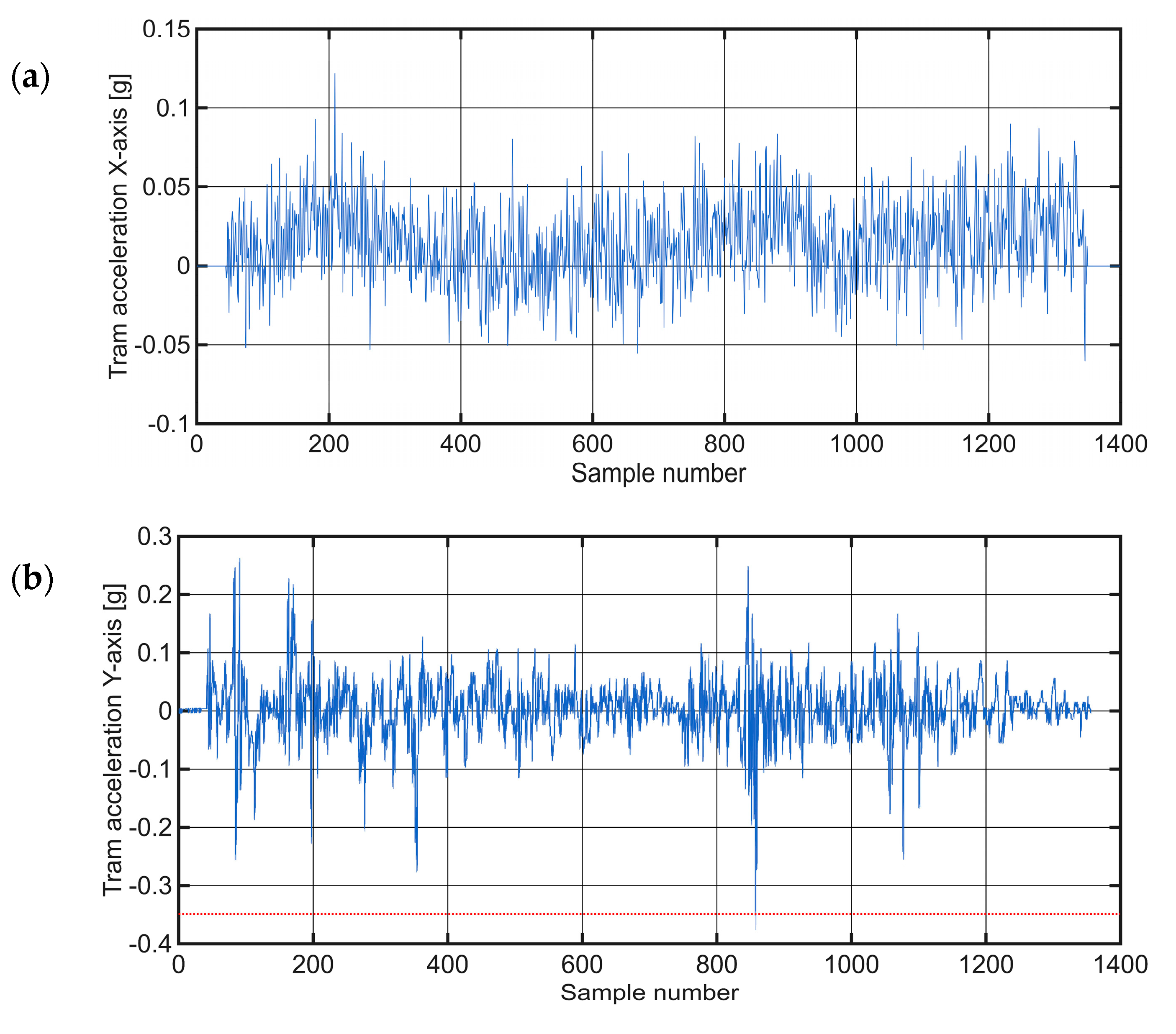 Figure 8a illustrates a minimum signal activity in the interval from 0 to 80 corresponds to the standstill of the tram at traffic signals or stops. Acceleration phases appear as upward slopes (e.g., sampled values 80–280), while deceleration is reflected in downward trends. When driving steadily, the values oscillate around the zero point. Minor baseline shifts (e.g., oscillation at −0.05 g) are due to slight misalignment of the sensor and are considered negligible.