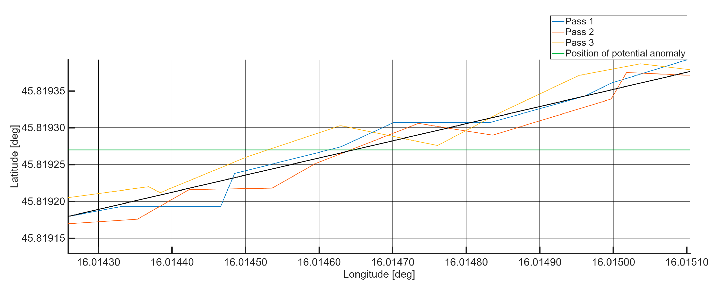 Figure 13 illustrates the strong spatial convergence of the GPS trajectories recorded during three independent measurements passes by the VTAD prototype, specifically highlighting the area around a detected anomaly. This close alignment of the three traces clearly demonstrates the high level of positional repeatability achieved and validates the operational stability of the VTAD sensor configuration during field testing.