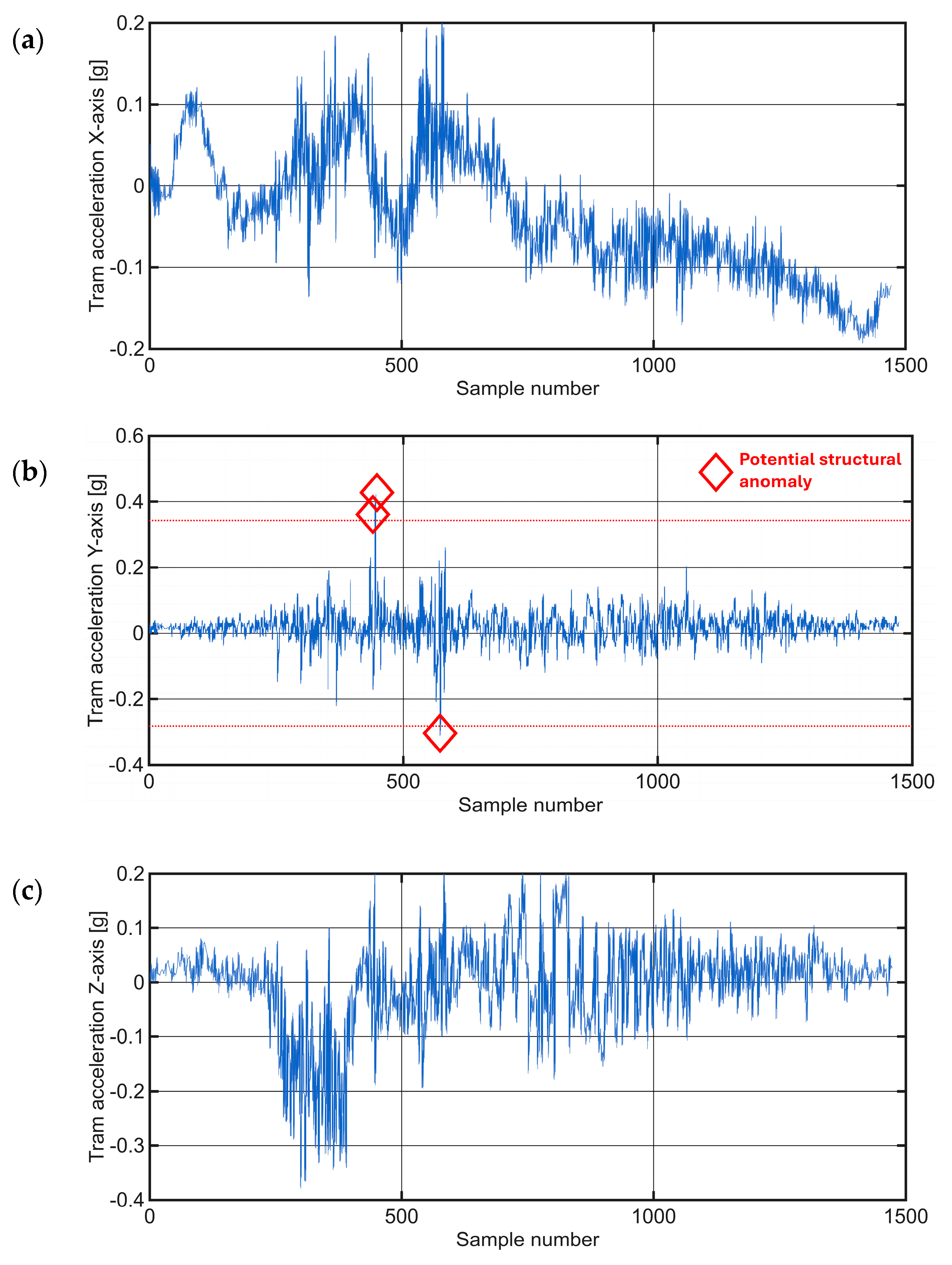 X-axis acceleration: The X-axis is aligned with the tram direction of travel and reflects longitudinal acceleration and deceleration.