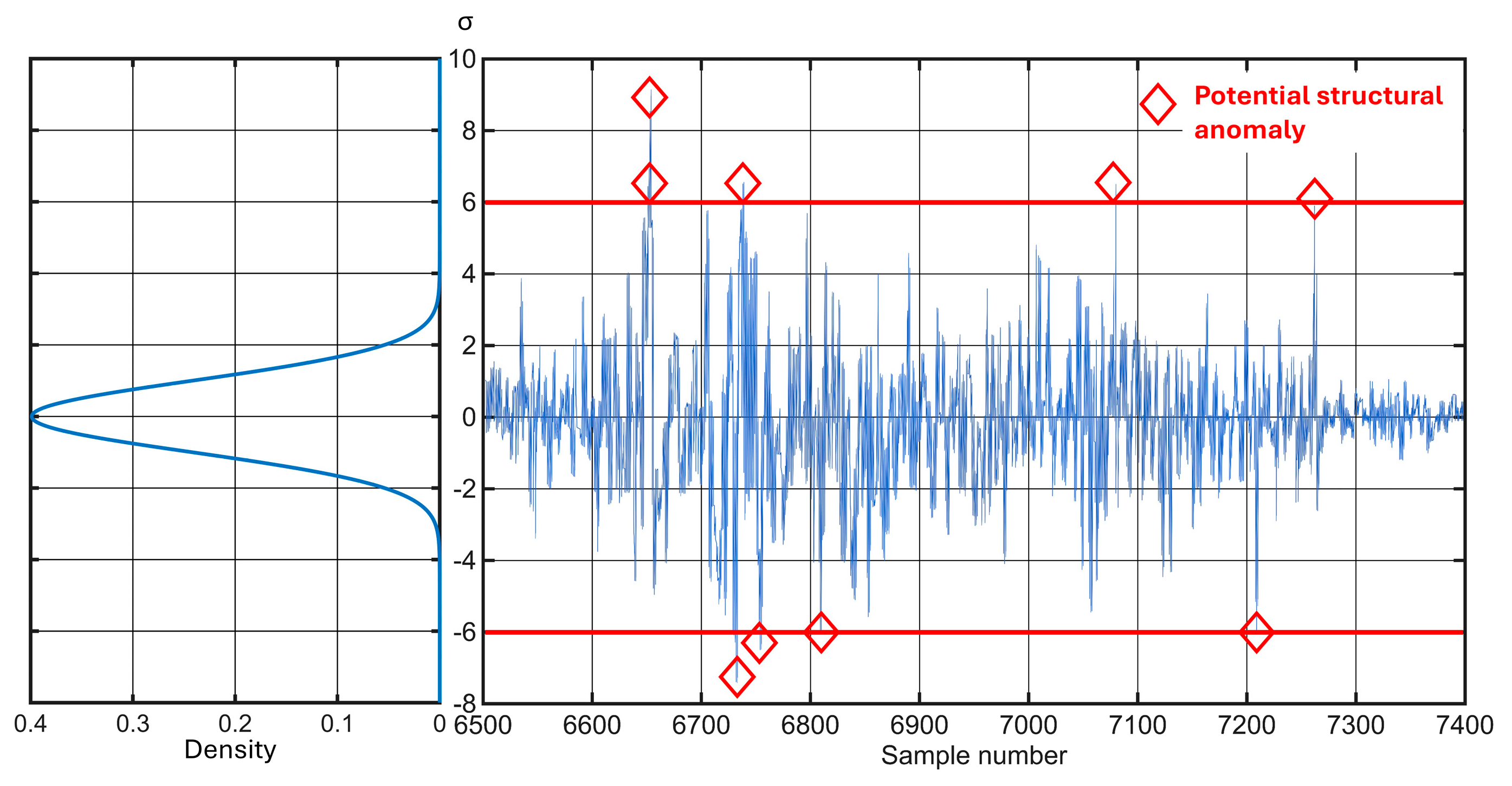 Figure 20. This visualization overlays the raw sensor data with a normal distribution curve to illustrate how the thresholds for anomaly detection are determined. The distribution is centered around the empirical mean; deviation intervals are defined as multiples of the standard deviation (σ). All amplitude values that fall within the interval [−6σ, +6σ] are considered statistically normal and negligible. Conversely, values that fall outside this strict range, meaning they deviate from the mean by more than six standard deviations—can be classified as potential structural anomalies with 99.999998 confidence. This strict threshold ensures that only highly significant and probable track deterioration is flagged, minimizing false alarms and focusing maintenance efforts on critical areas.