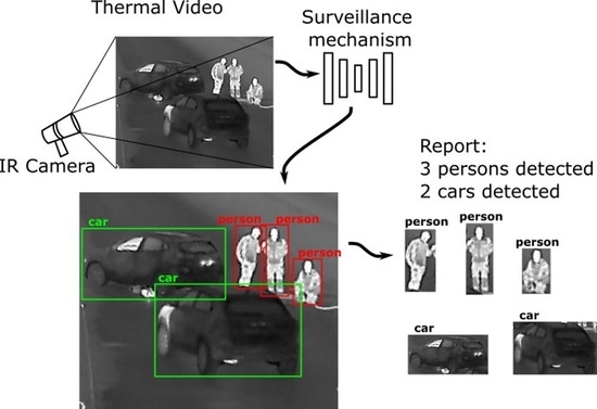 - Zilkha, M.; Spanier, A.B. Real-time CNN-based object detection and classification for outdoor surveillance images: Daytime and thermal. In Proceedings of the 2019 Artificial Intelligence and Machine Learning in Defense Applications, Strasbourg, France, 10–12 September 2019; SPIE: Bellingham, WA, USA, 2019; Volume 11169, p. 1116902. [Google Scholar]