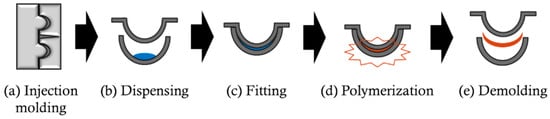 - Musgrave, C.; O’Toole, L.; Mao, T.; Li, Q.; Lai, M.; Fang, F. Manufacturing of soft contact lenses using reusable and reliable cyclic olefin copolymer moulds. Polymers 2022, 14, 4681. [Google Scholar] [CrossRef]