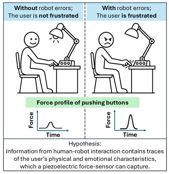 As physical interaction continues to complement or even surpass visual and voice-based interfaces in various domains, understanding how users interact with devices (such as pressing, gripping, or handling them) may provide valuable insights into their experience [4,5,6,7]. This perspective aligns with recent efforts to design robots that are not only responsive to commands but also tailored to how those commands are delivered [4,8]. Within the context of data-driven robotics, interpreting physical human-robot interaction (HRI) as dynamic signals that contain traces of the user’s emotional state opens up new possibilities for implementing off-the-shelf sensors [9,10].