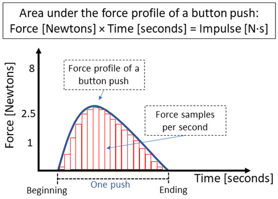 Figure 3 illustrates the force profile of a button press, represented as a function of time. The blue profile depicts the dynamics of force applied during a single button press, while the red vertical bars indicate discrete force samples captured per second. The area under the curve, corresponding to the integral of force over time, represents the mechanical impulse delivered during the interaction. The diagram illustrates the temporal boundaries of a complete button press, from onset to release. It emphasizes that we calculated the impulse as the product of force (in Newtons) and time (in seconds).