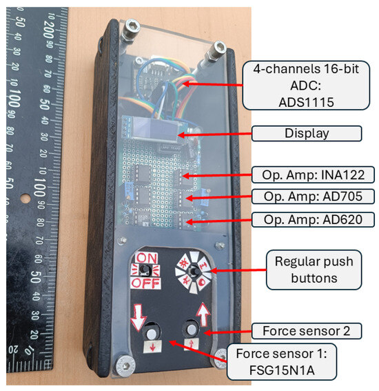 Table 1 shows that the “left” sensor reliably detected forces as low as 1 g; on the other hand, the “right” sensor has an initial sensitivity of 20 g (when it starts providing digital readings). Beyond 20 g, both sensors behaved similarly, maintaining a consistent analog-to-digital conversion factor of 3–4 digital counts per gram. At higher forces, the left button reported slightly higher values than the right one, but both exhibited a systematic, nonlinear increase above 7 N. While these disparities limit absolute accuracy at higher loads, the results are predictable and consistent across sensors. We test the sensors by connecting them to each other’s signal processing channel; the variance followed the sensors, indicating that the variation is in the sensors and not in the signal processing circuitry.
