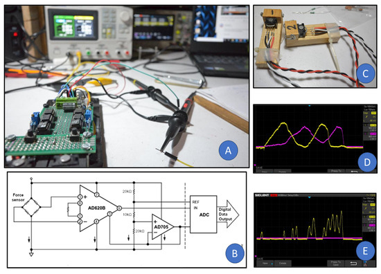 Figure 5. (A) Lab testing of the force sensors coupled to a chain of Op. Amp. (instrumental amplifiers) and a 16-bit ADC, (B) base electric circuit for the Op. Amp. AD620 and resistive bridge, (C) piezoresistive force sensors, Honeywell FSG15N1A, wired and set on their holders, (D) oscilloscope image of the two force sensors being pushed at the same time without issues in the rail-to-rail amplified signal, (E) oscilloscope image of one force sensor being pushed at a time without affecting the stability of the signal from the second sensor.