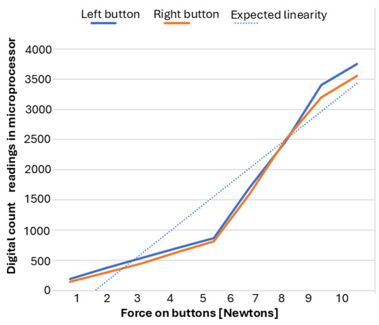 The Honeywell FSG15N1A sensors were calibrated with reference weights ranging from 1 g to 1100 g (0.01 N to 10.78 N) to map applied force to digital counts and compare the readings from the left and right buttons.