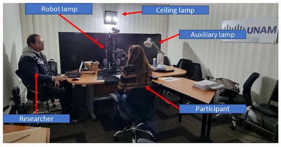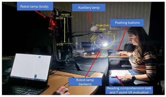 Participants were seated in a windowless video-conference room, with the robot lamp positioned in front of them and a control panel to the right (Figure 7 and Figure 8). Using the robot lamp interface, they adjusted the lamp settings (height, projection angle, and brightness) to achieve the preferred lighting for a reading and writing comprehension task and UX evaluation. Each participant repeated this cycle five times, with the robot lamp behaving slightly differently each time by enacting robot errors and changing its operation mode (from manual to assisted). During the experimental tests, the ceiling lamp and auxiliary lamp remained turned off. The robot’s interface was on the right side of the participants, meaning that all participants used their right hand regardless of their dominant hand. Additionally, hand and finger size were not measured.