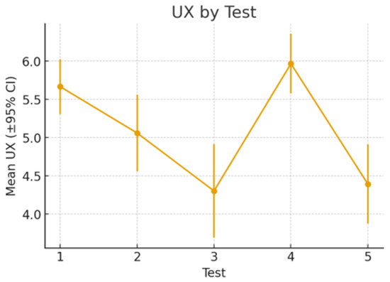 Figure 9. Mean user experience (UX) scores across five test sessions with 95% confidence intervals.