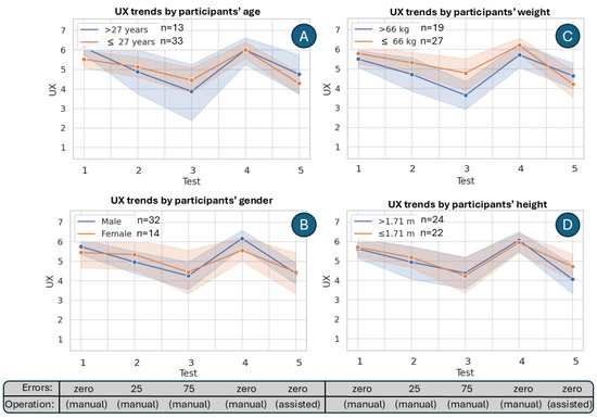 Figure 10. Comparison of UX ratings across five tests grouped by the participants’ demographic information (A), age (B), gender (C), weight, and (D) height. Shaded areas represent 95% confidence intervals to visualize uncertainty around the mean trends.