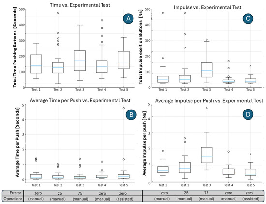 Figure 11. Boxplots of interaction metrics across five testing sessions. (A) Time spent pushing the force-sensing buttons of the robot lamp. (B) Average time per push. (C) Impulse (force applied multiplied by push duration). (D) Average impulse per push.