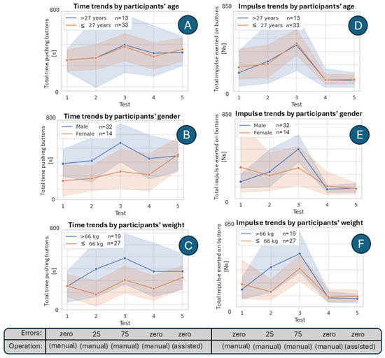 In Figure 12, we present the interaction between test sessions and participant characteristics (age, gender, and weight) in terms of time and impulse. Plot A shows the interaction between test and age group with respect to time, where older participants (>27 years) generally spent more time per push than younger participants (≤27 years). Plot B illustrates the interaction between test and gender group with respect to time, indicating that men consistently spent more time per push than women across all sessions, particularly in Test 3 where the gap peaked. Plot C displays the interaction between test and weight group with respect to time, showing that heavier participants (>66 kg) exhibited longer pushing times than lighter participants, especially in Tests 2 and 3.
