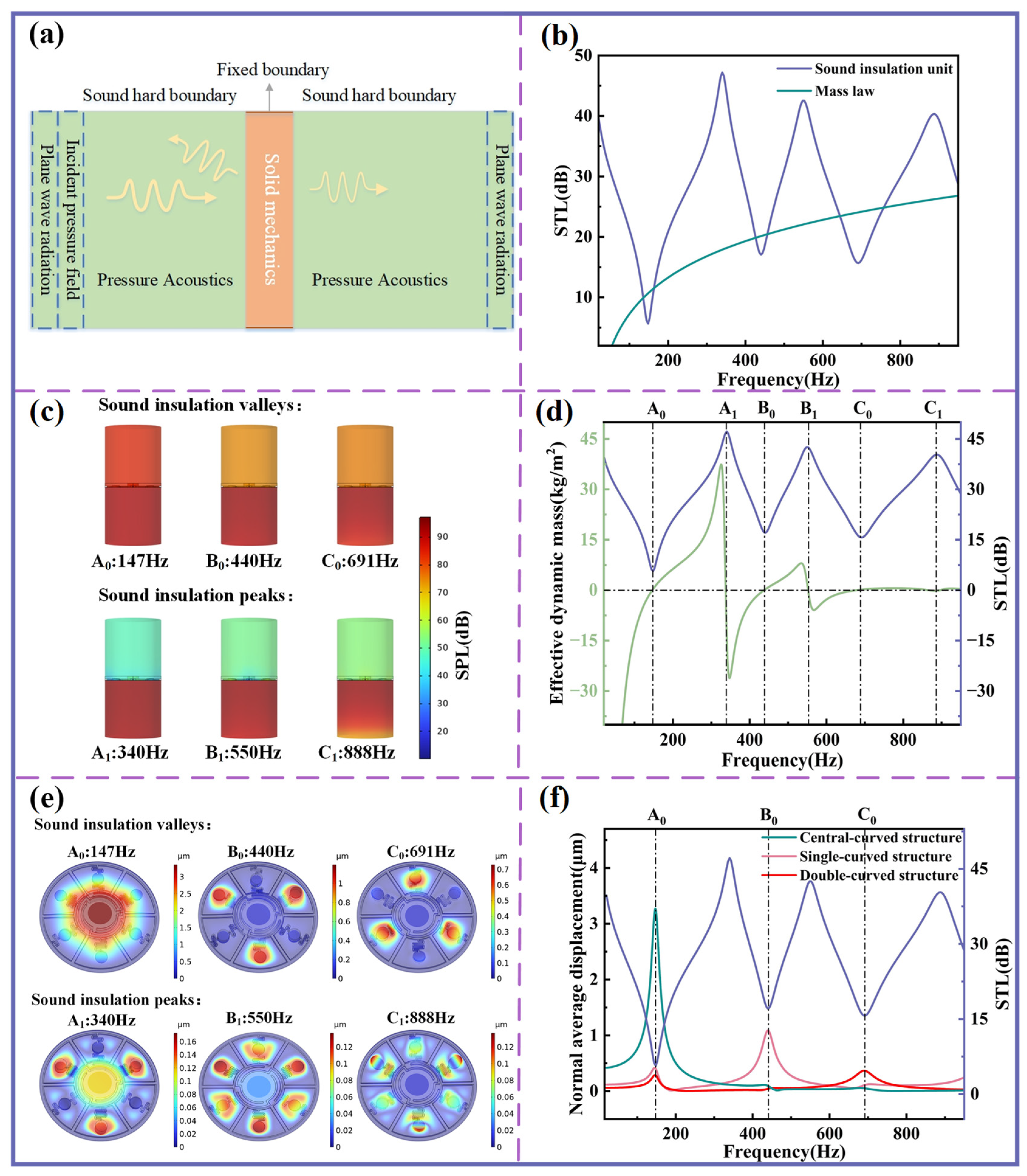 where is the averaged pressure difference across the sound insulation unit, representing the effective excitation force, and denotes the average acceleration of the sound insulation unit. The relationship between the effective dynamic mass and the STL is shown in Figure 2c. For clarity, the three valleys in the STL curve are labeled A0 (147 Hz), B0 (440 Hz), and C0 (691 Hz), while the corresponding peaks are labeled A1 (340 Hz), B1 (550 Hz), and C1 (888 Hz), as marked in the diagram.