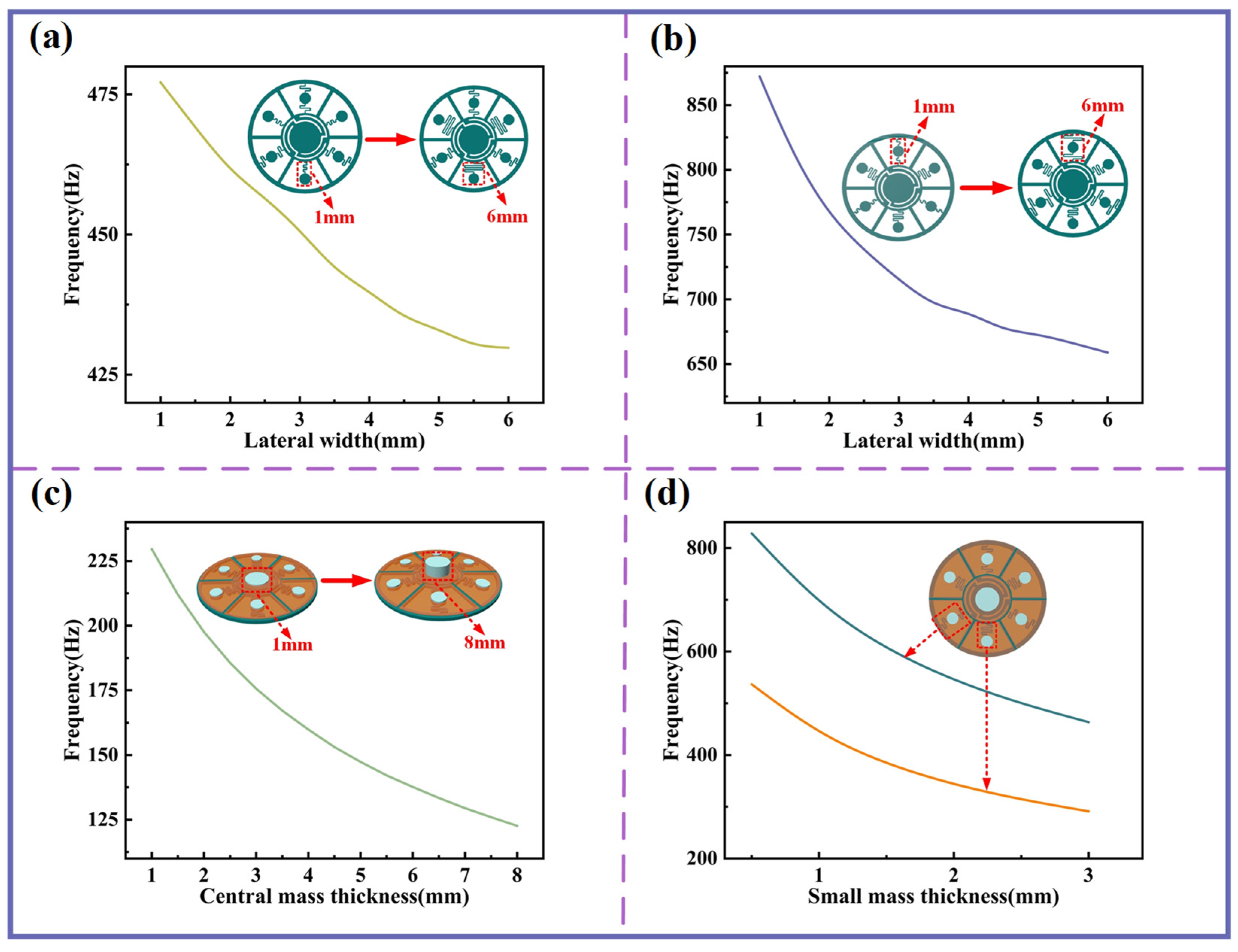 The influence of beam lateral width and mass blocks on resonant frequency. (a) Variation in resonant frequency of single-curved structures with different beam lateral widths. (b) Variation in resonant frequency of double-curved structures with different beam lateral widths. (c) Variation in resonant frequency with different central mass thicknesses. (d) Variation in resonant frequency with different small mass block thicknesses.