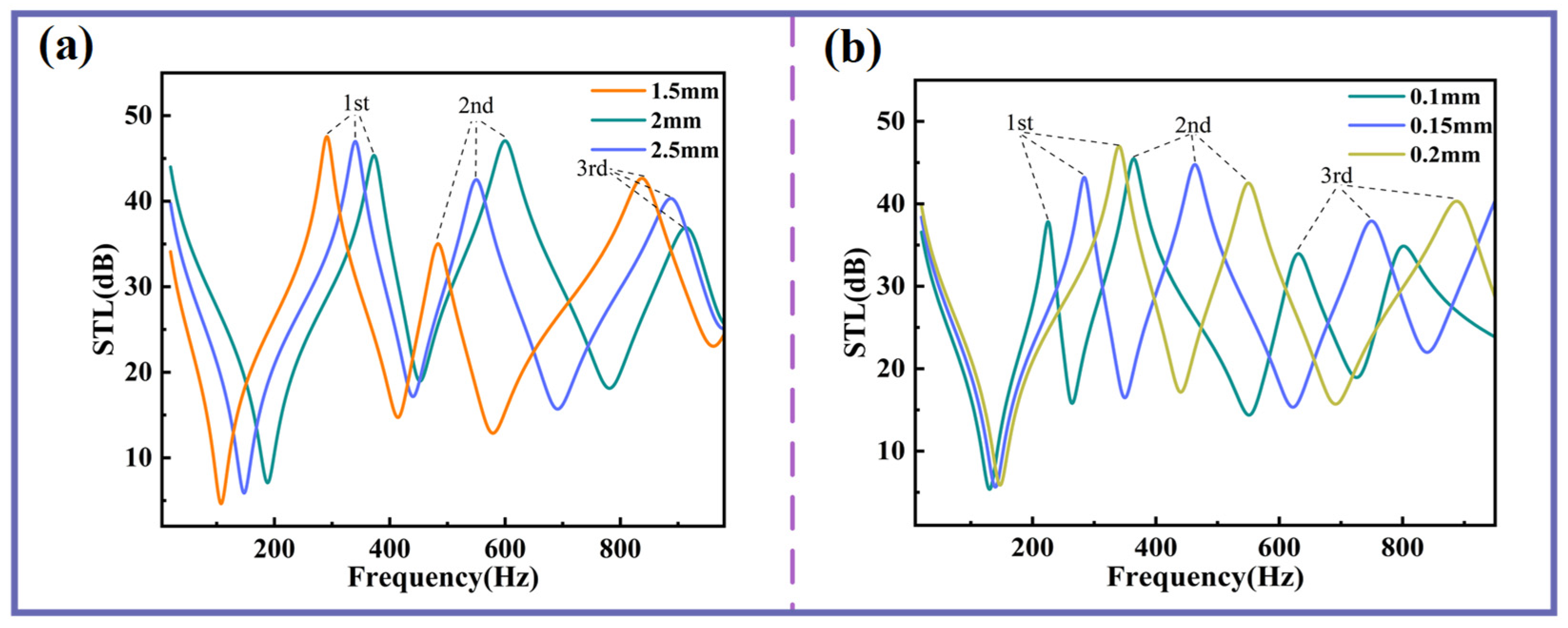 Figure 4a,b demonstrate that as the thickness of the planar spring or Kapton membrane increases, all three sound insulation peaks and valleys shift toward higher frequencies. From the perspectives of STL and sound insulation bandwidth, the thickness of the planar spring exerts a more pronounced influence on the second and third sound insulation peaks, significantly enhancing both their STL and the bandwidth of these peaks. In contrast, membrane thickness has a greater impact on the first sound insulation peak but exhibits almost no effect on the first sound insulation valley.