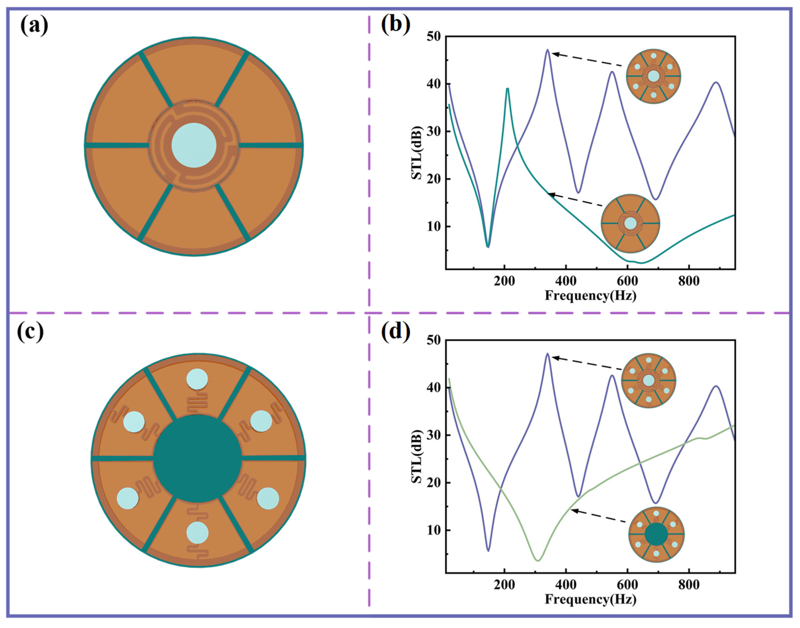 The impact of planar spring structures on sound insulation performance is further examined. Figure 5a,b show the configuration and STL curves when only the central-curved structure and its surrounding Kapton membranes are retained. Under this condition, the first sound insulation valley nearly coincides with that of the original structure, while the second sound insulation peak is absent due to the lack of resonant contributions from the other curved structures. As illustrated in Figure 5c, replacing the bottom of the central-curved structure with a homogenous PLA disk yields the STL curve shown in Figure 5d, which demonstrates minimal sound insulation performance in the low-frequency range. These results confirm that the central-curved structure plays a pivotal role in achieving low-frequency sound insulation.