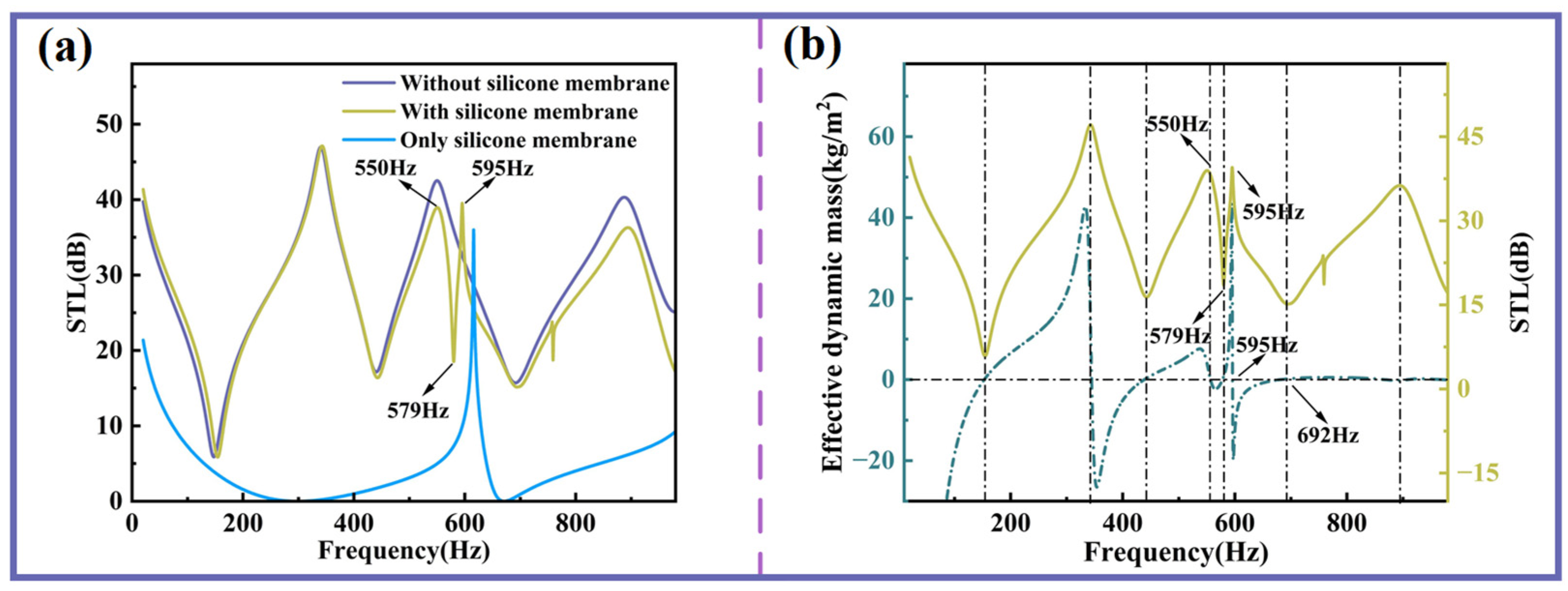 The influence of the silicone membrane on STL. (a) Sound insulation curves with and without silicone membrane. (b) Effective dynamic mass and STL curve with the silicone membrane.