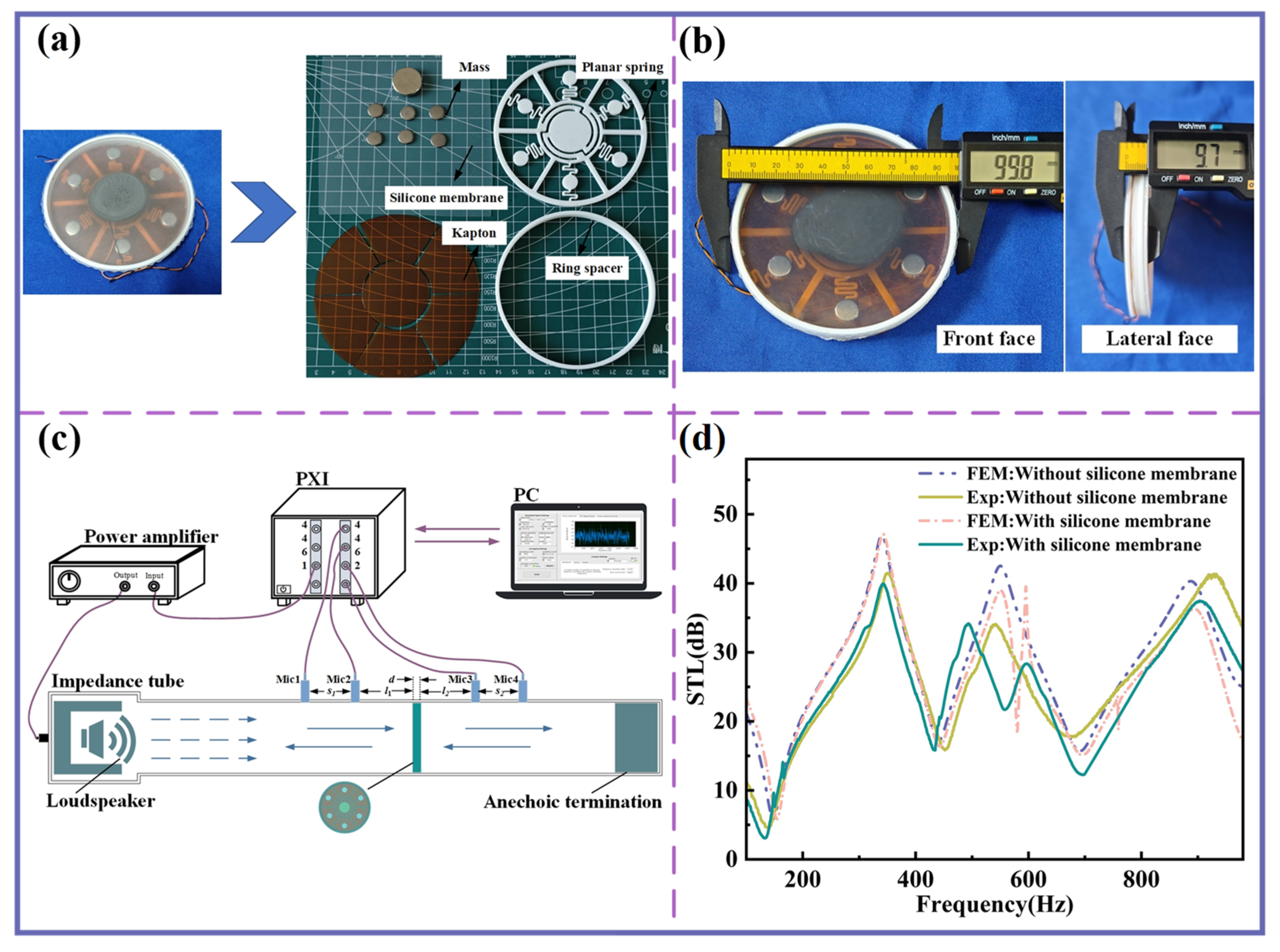 The experimental results are shown in Figure 7d. The STL curves exhibit multiple distinct insulation peaks and valleys, consistent with the FEM predictions, both with and without the silicone membrane. The measured average sound insulation within 1000 Hz exceeds 25 dB. A frequency shift is observed in both cases, particularly with the silicone membrane. This shift is attributed to the complex nonlinear acoustic–vibration coupling among the silicone membrane, the sound insulation unit, and the trapped air layer.