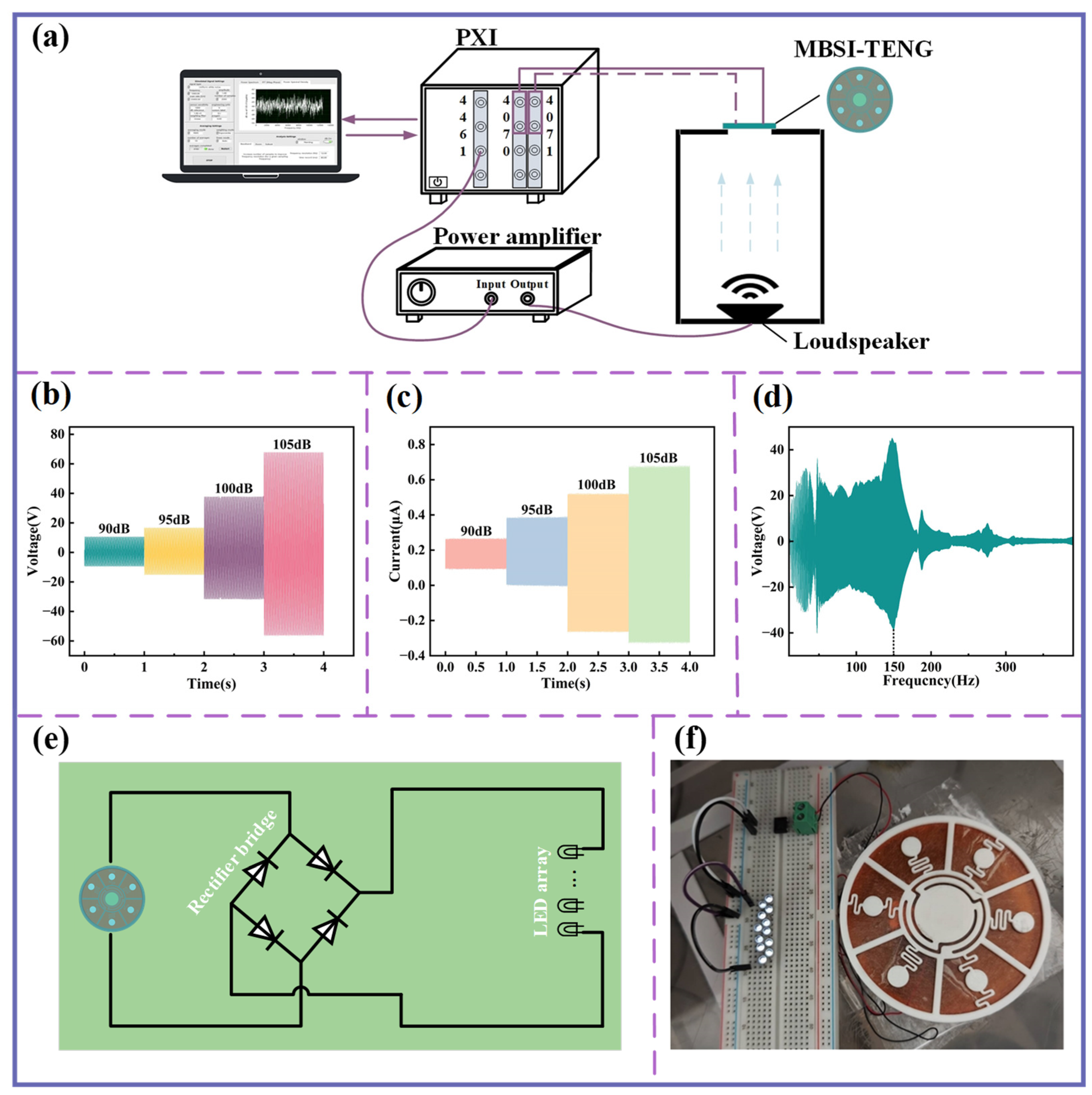 Acoustic–electric conversion performance of the MBSI-TENG. (a) Experimental setup for evaluating the acoustic-to-electric conversion performance of the MBSI-TENG. (b) Voltage signals under different SPL values. (c) Current signals under different SPL values. (d) Voltage response under swept sine excitation. (e) Circuit diagram for MBSI-TENG acoustic-to-electric conversion. (f) Photograph showing the LED array being powered.