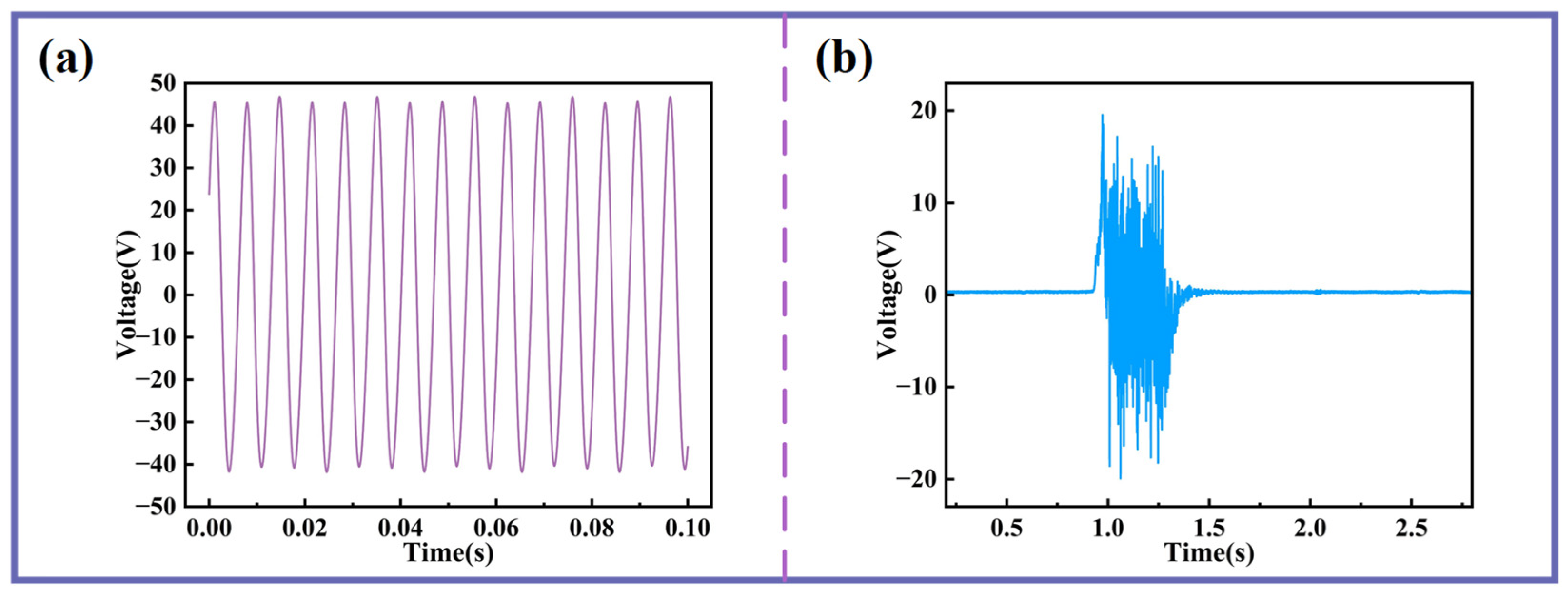 The application potential of MBSI-TENG in acoustic sensing. (a) Voltage response under 150 Hz sinusoidal excitation. (b) Voltage response during gentle blowing.