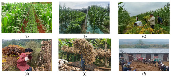 Soybean-harvesting process and current status in southwestern areas, illustrating key mechanization challenges. (a) Intercropped soybean and corn on hilly terrain, requiring precise navigation and selective harvesting technologies; (b) hilly terrain for cultivation, limiting the size and stability of conventional machinery; (c) manual pulling and harvesting of soybeans, representing the low-efficiency baseline that mechanization aims to replace; (d) manual carrying of soybeans, highlighting the logistical challenges in fragmented terrain; (e) sun-drying of harvested soybeans, an inefficient post-harvest step that combines are designed to eliminate; (f) manual soybean threshing, a process prone to high grain loss and damage, which mechanical systems must improve upon.