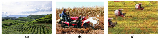 Analysis of mechanization challenges for soybeans in hilly and mountainous regions. (a) Steep slopes, uneven ground, and operational safety hazards; (b) small soybean harvester operating in hilly–mountainous areas; (c) soybean combine harvester only suitable for relatively flat terrain, with cross-slope and longitudinal slope ≤ 10°.