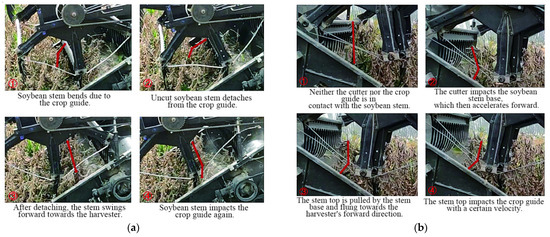 Movement characteristics of the soybean crop during harvesting. (a) Stem movement when the reel’s operating range is small; (b) interaction characteristics between header and soybean stems when the machine is mismatched.