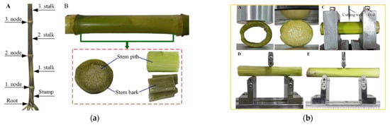 Research on crop stems/stalks to advance the development of mechanized harvesting. (a) Study on crop stem component properties. (A) dividing of the cornstalk, (B) structural compositions of the inter-nodal section of the cornstalk.; (b) schematic of mechanical performance test for maize stalks and their components. (A) stem bark compression test, (B) cornstalk compression test, (C) cornstalk shear test, (D) stem pith bending test, (E) cornstalk bending test.