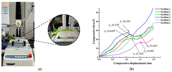 Methodology for obtaining the mechanical behavior curves of crop stems. (a) Stem compression characteristic test; (b) study on stem displacement characteristics.