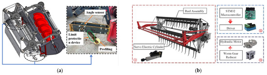 Design of a soybean header for complex terrain. (a) Flexible header and active ground-profiling technology; (b) design of terrain-detecting adaptive profiling header.