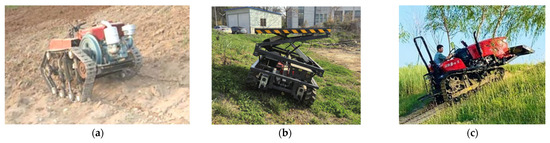 (3) Sensor-enhanced walking system and traction optimization: Addressing the complex conditions of hilly–mountainous slopes, primary development directions include tracked or four-wheel-drive systems. While these mechanical solutions are foundational, their performance and safety are significantly enhanced through sensor-based control systems. Integrating wheel-speed sensors allows for real-time slip detection and intelligent traction control, automatically engaging differential locks or modulating power. Prototypes of such sensor-enhanced systems, particularly in specialized vineyard and forestry tractors, have shown the ability to reduce wheel slip by over 30% on steep slopes, validating the concept for challenging agricultural terrains. Furthermore, data from the IMU can be used to monitor dynamic stability, providing early warnings for potential rollovers. Future exploration includes forward-looking sensors like LiDAR or cameras to proactively assess terrain conditions (e.g., moisture and roughness) and adjust the drive control strategy before encountering hazardous terrains [111,112].