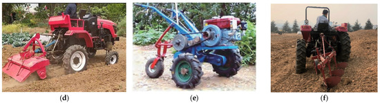 Design of a soybean header for complex terrain. (a) Contour-parallel driving of hilly tracked tractor with leveling; (b) chassis adjustment using neural network algorithm; (c) agile tractor for hilly–mountainous areas; (d) four-wheel independent leveling tractor technology and multi-functional walking system; (e) small walk-behind adaptive tractor for hilly–mountainous regions; (f) multi-functional walking system and traction application.