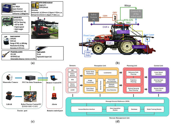 Research on an intelligent tractor suitable for operating harvesting equipment in hilly and mountainous areas. (a) Hardware of a robotic tractor for autonomous path planning and obstacle avoidance; (b) schematic diagram of the autonomous harvesting planning system for a robotic tractor; (c) remote safety system for a robotic tractor using a monocular camera and the YOLO vision-based obstacle-avoidance method; (d) overall architecture of the autonomous operation control system for intelligent agricultural machinery.