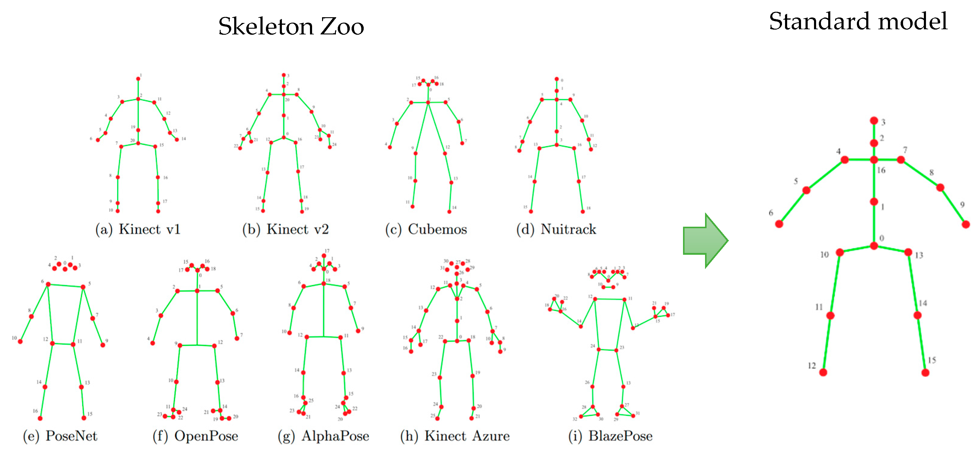 6] divides all forms of skeletal models into three categories and provides a number of simple equations for each category for conversion. Such a procedure allows them to transform different skeletal models into the standard form (