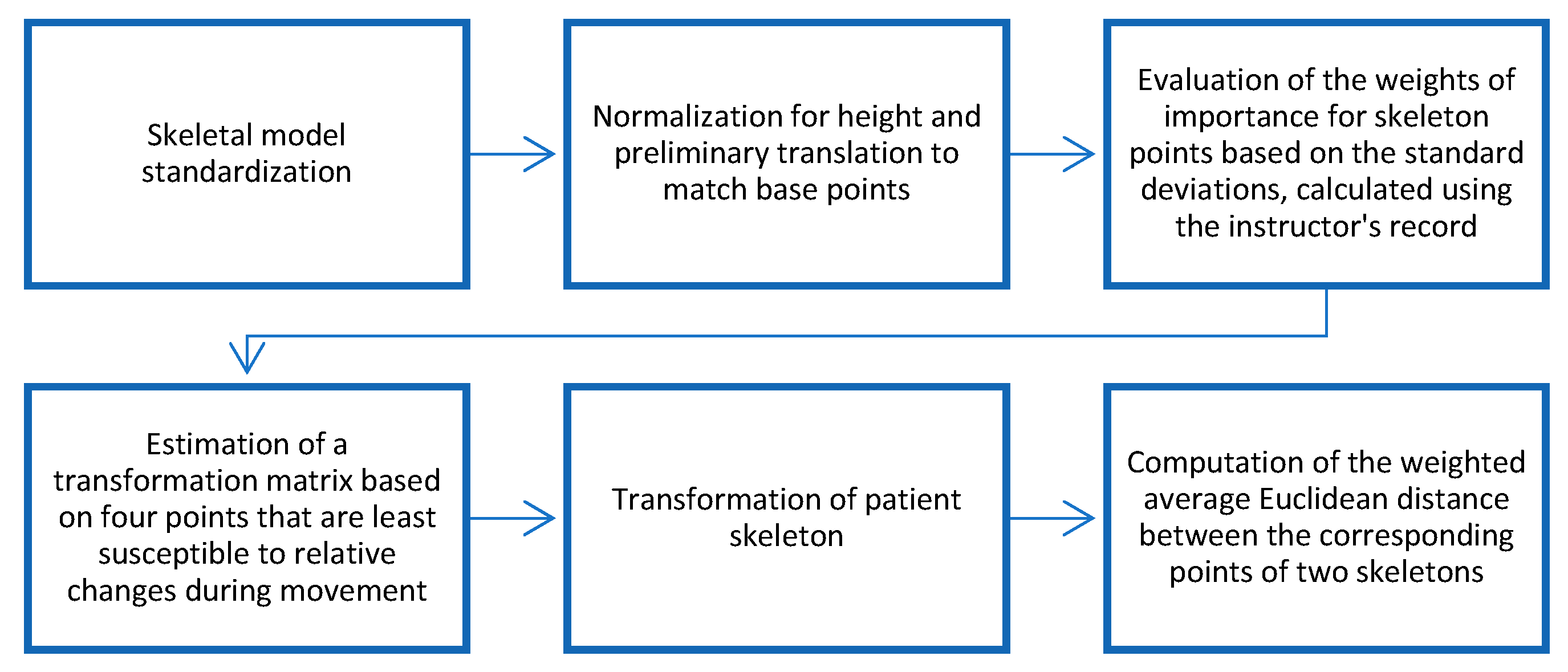 22]), allows us to take these characteristics into account to improve the accuracy and reliability of assessing the patients’ rehabilitation progress. The difference between the already existing methods and the present method is that, here, we have a specific goal that could be applied to patients who have suffered from motion disorders. For this reason, we have extracted the skeletons of the instructor and the patient and found the degree of similarity using a novel algorithm termed as the “Human Skeleton-based Balanced Time Warping algorithm”.